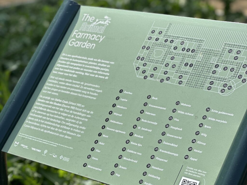 Om zelfgenezing onder dieren ook in het stadslandschap zichtbaar te maken en te bevorderen, richtten we de tuin van Museum Jan Cunen blijvend in als apothekerstuin voor dieren. De tuin is tevens een introductie in mijn langlopende onderzoek naar zoöpharmacognosie, de zelfmedicatie door dieren met natuurlijke middelen. Het ontwerp van de tuin is gemaakt door Sandra van den Beuken.
